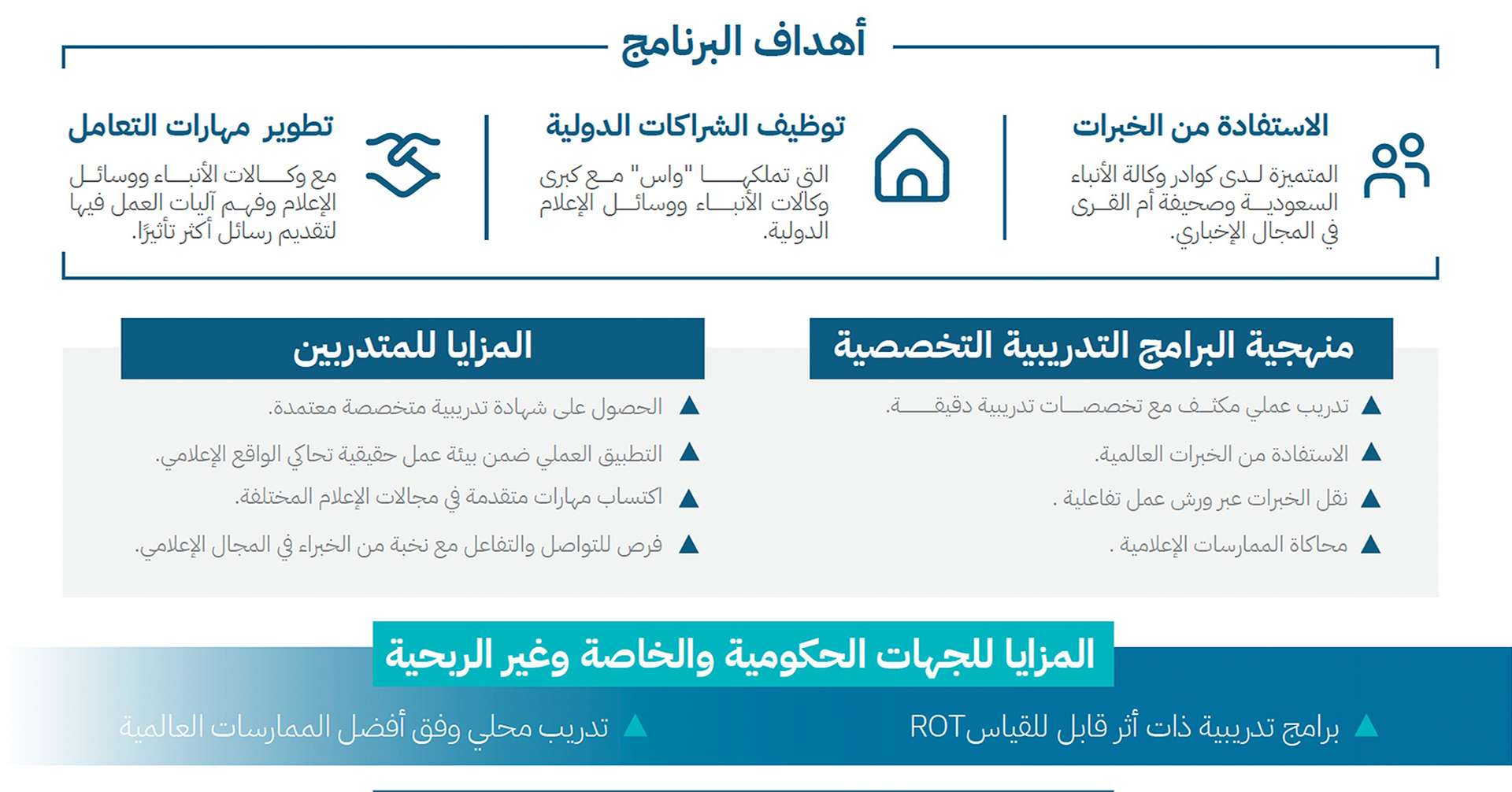 يهدف البرنامج التدريبي "الذكاء الاصطناعي في الصحافة المعتمدة على البيانات" إلى تطوير قدرات منسوبي الشؤون الإعلامية في الأجهزة الحكومية والخاصة في استخدام تقنيات الذكاء الاصطناعي لت...